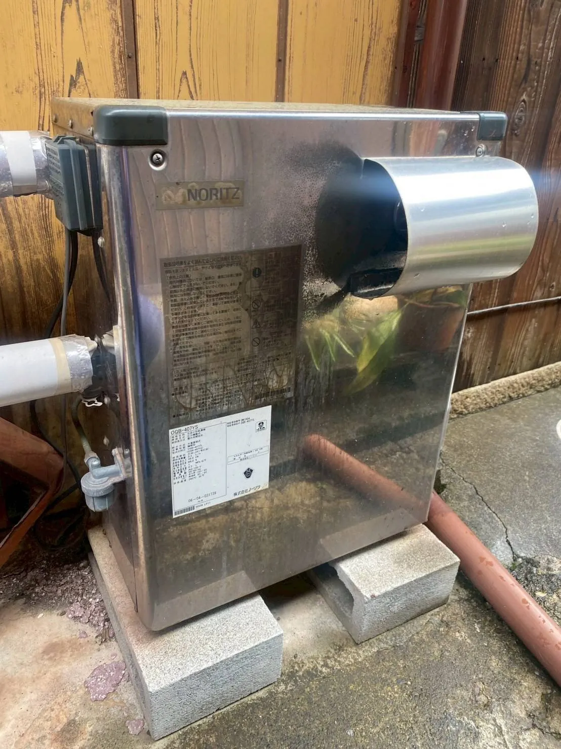 S様のご要望と、新たにガス配管工事が必要となる状況を考慮し、高効率なエコジョーズタイプのノーリツ ガス給湯器 GQ-C2034WSをご提案し、交換工事を行いました。